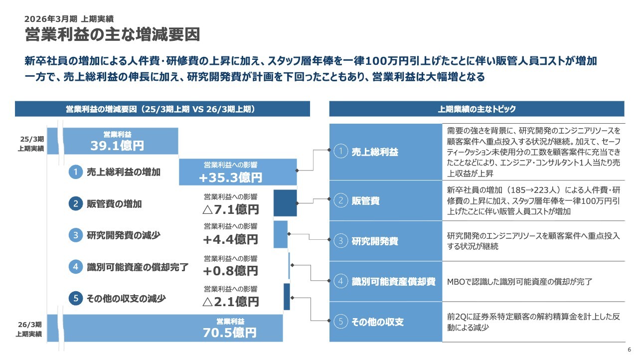 一方、研究開発費は前期上期と比べて4億4,000万円減少し、営業利益を押し上げる要因となっています。これは、顧客側のプロジェクトが非常に多忙だったことから、研究開発に振り向ける余裕がなかったためです。