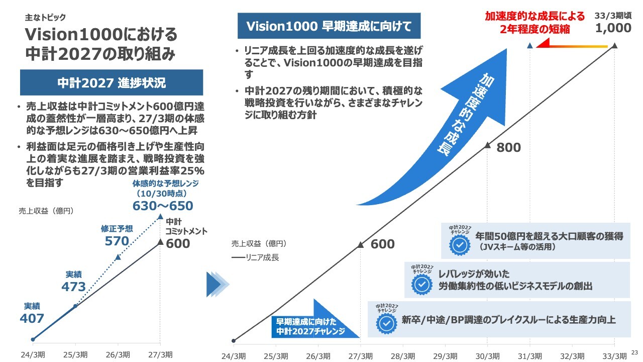2030年3月期に達成できるとすれば、「中計2027」が終了した後の次の中期計画がそのまま「Vision1000」になる可能性があります。それを踏まえ、この下期と来期は非常に重要な局面であると認識しています。