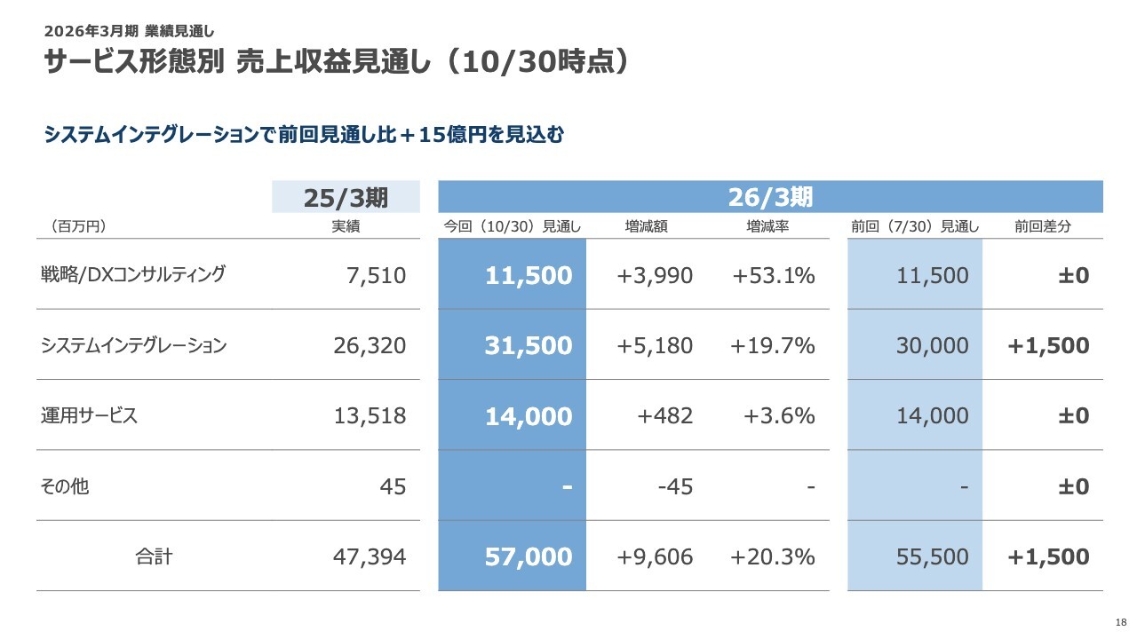 まずはサービス形態別です。ほぼすべてがシステムインテグレーションであり、前回の見通しである300億円から15億円増加し、315億円を見込んでいます。
