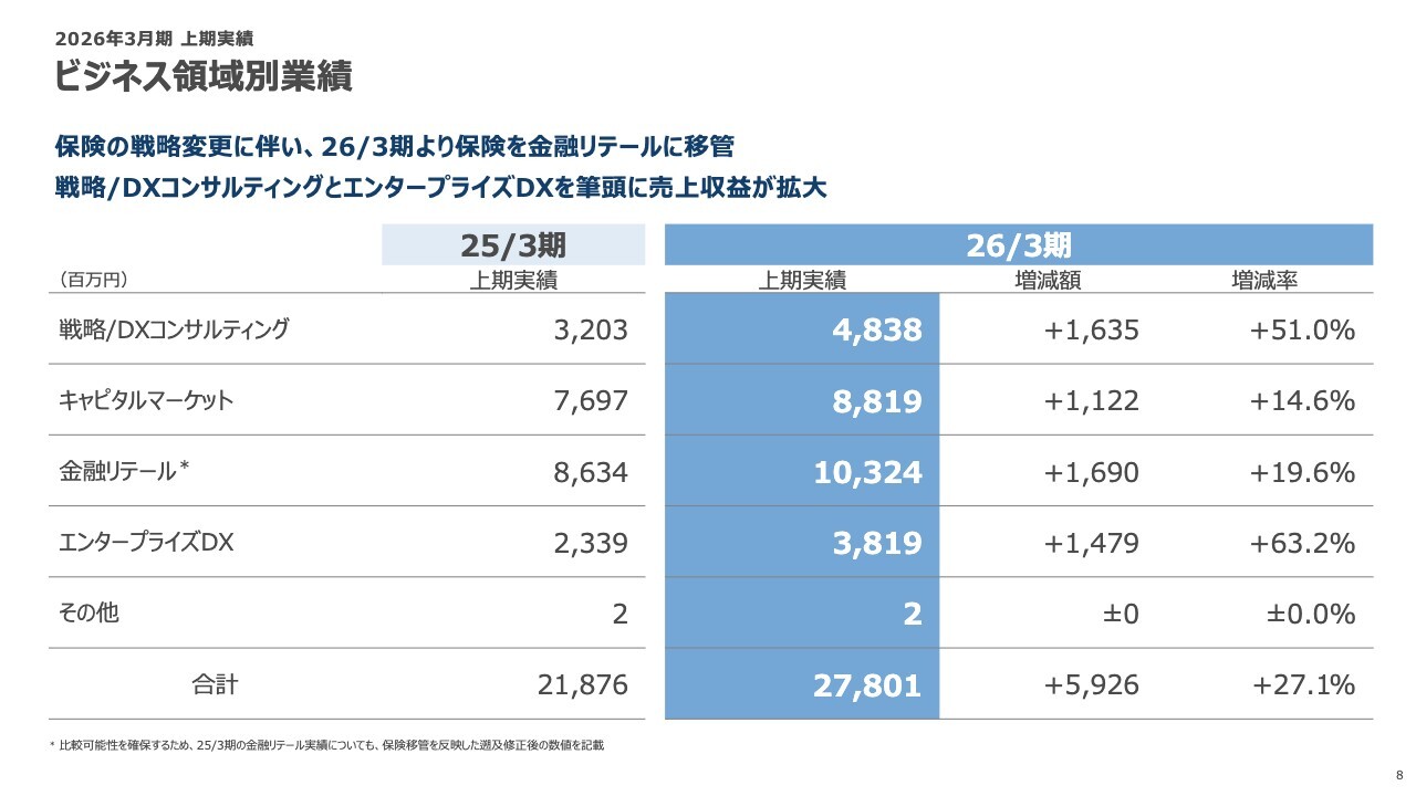 キャピタルマーケットの売上収益は、前年同期比14.6パーセント増の88億1,900万円となりました。金融リテールの売上収益は、前年同期比約20パーセント増の103億2,400万円です。非金融テクノロジーを担当するエンタープライズDXは非常に好調で、売上収益は前年同期比63.2パーセント増の38億1,900万円となりました。
