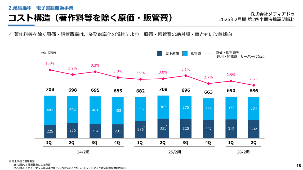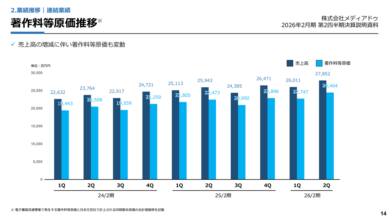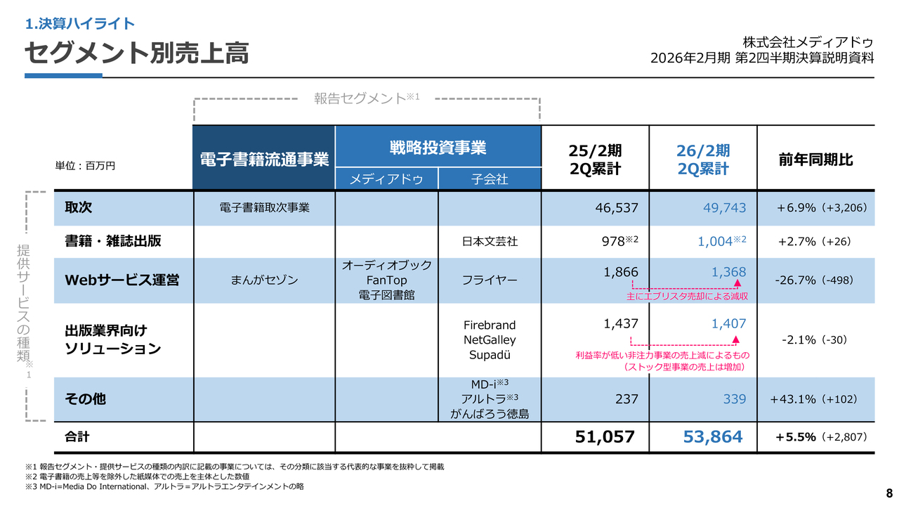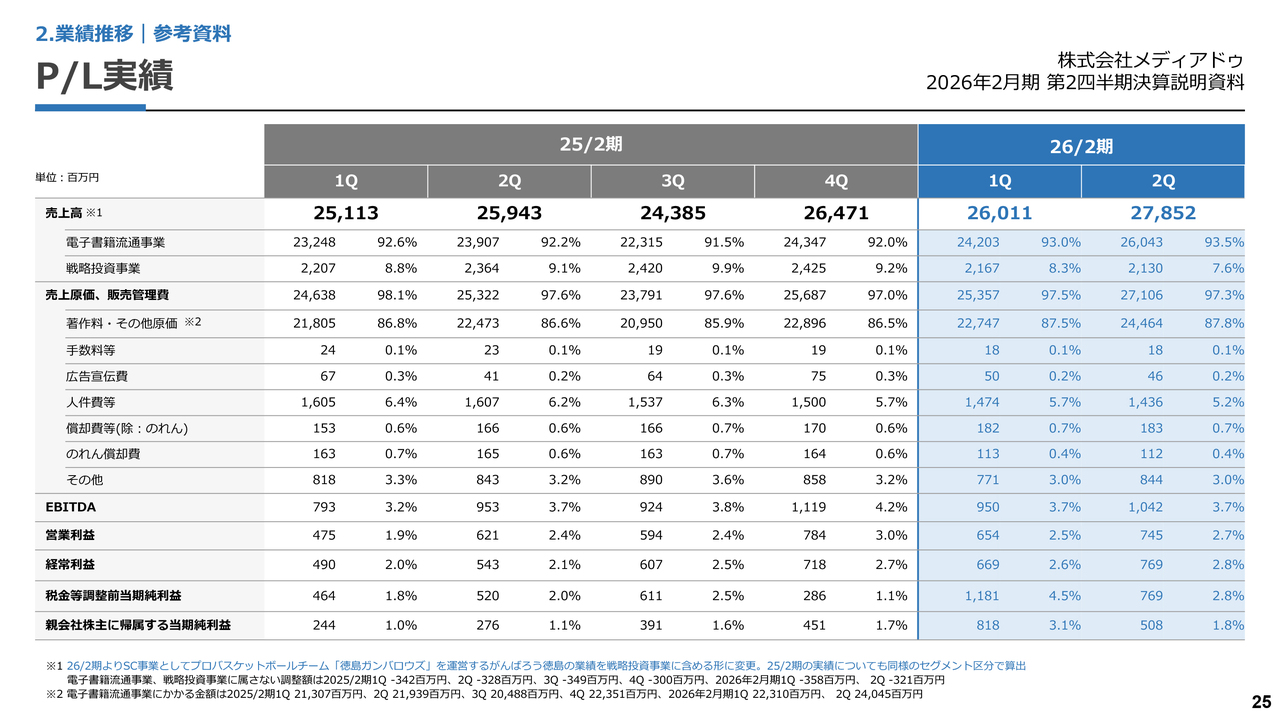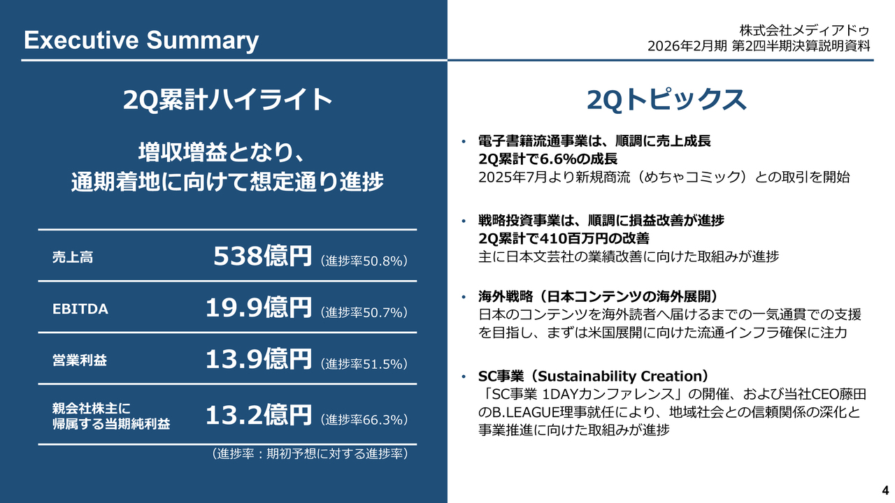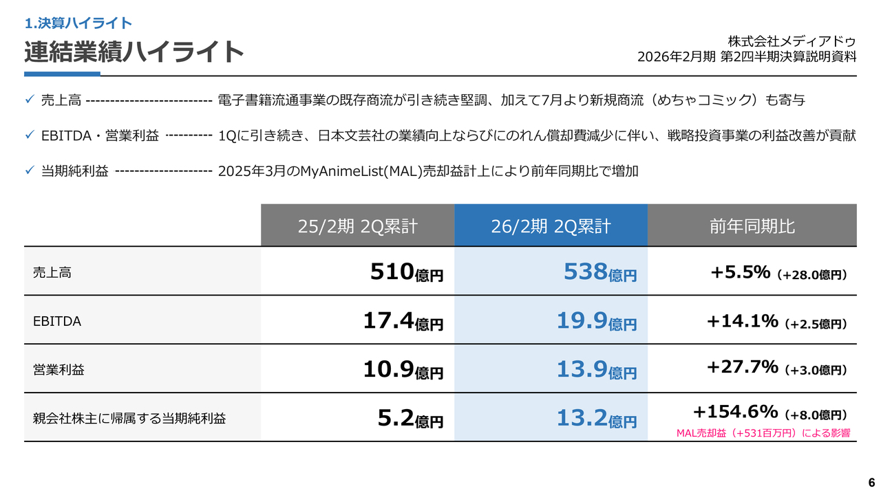 苅田明史氏(以下、苅田):株式会社メディアドゥ代表取締役副社長CFOの苅田です。みなさま、本日はご多用の中、当社の決算説明会にご参加いただき、誠にありがとうございます。2026年2月期第2四半期の決算説明会を開始します。