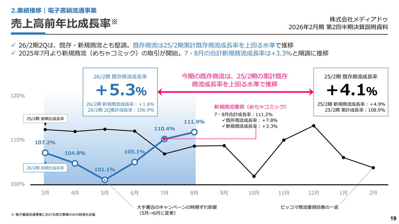 注目いただきたい点は、前期の既存商流成長率が4.1パーセントであったのに対し、今期2026年2月期の上期では5.3パーセントにまで成長している点です。
