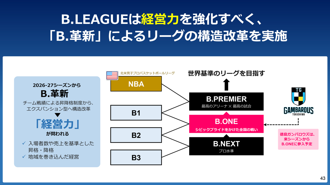Bリーグについてです。昨今、スポーツ事業においても経営力が重要視されており、Bリーグでも経営力を重視する方向に変革します。