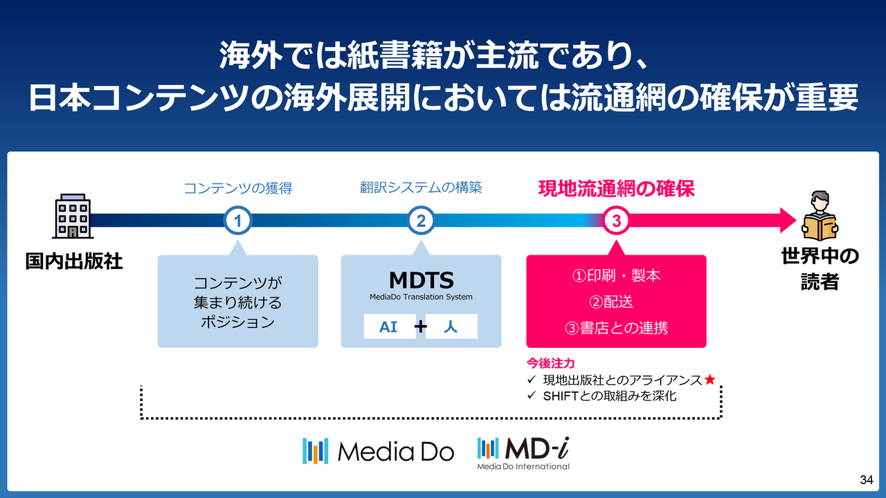 当社が考える基本的な方針としては、日本語で納品された本を各国言語に翻訳し、各国で配信するということです。電子書籍はもちろんのこと、今まで当社があまり注力してこなかった紙の本の流通にも注力します。