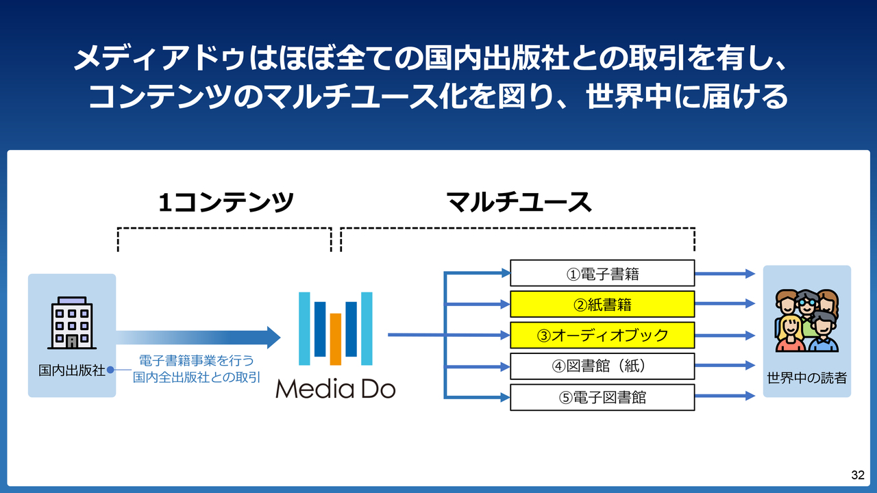 これまでメディアドゥは、日本の本の翻訳や世界展開には十分に取り組めていませんでした。今後は、日本の本を積極的に翻訳し、紙の本、電子書籍、オーディオブックとして展開していく上で、非常に有効なキラーソリューションになると考えています。