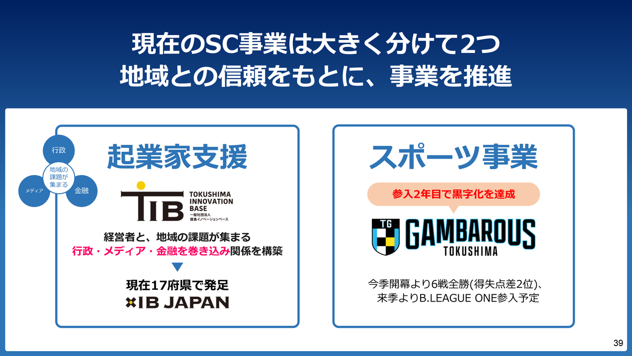 SC事業において業績面への貢献が大きいのは、B3リーグのバスケットボールチーム「徳島ガンバロウズ」の運営団体の損益です。