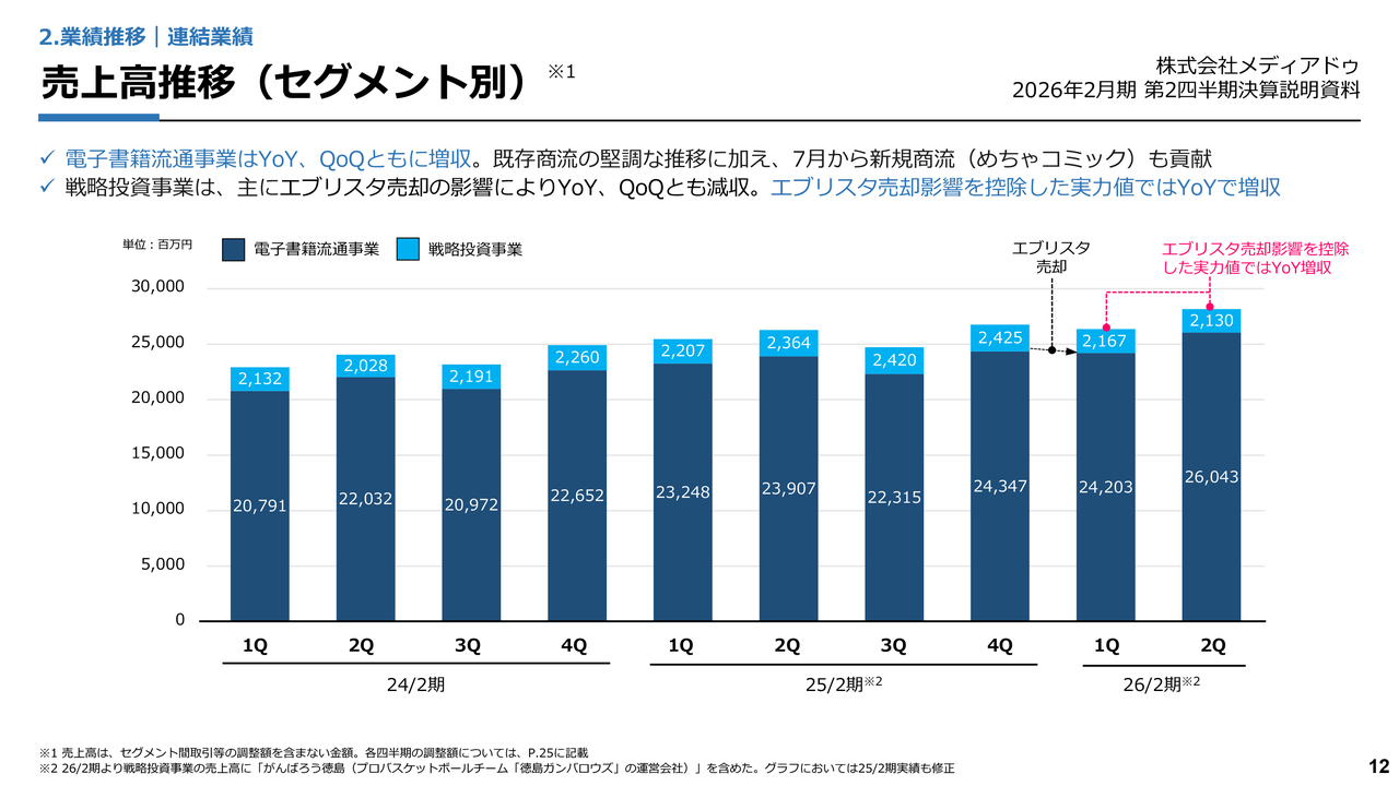 セグメント別の売上高についてご説明します。当社は、電子書籍流通事業と戦略投資事業の2つに分けてセグメント別に開示しています。