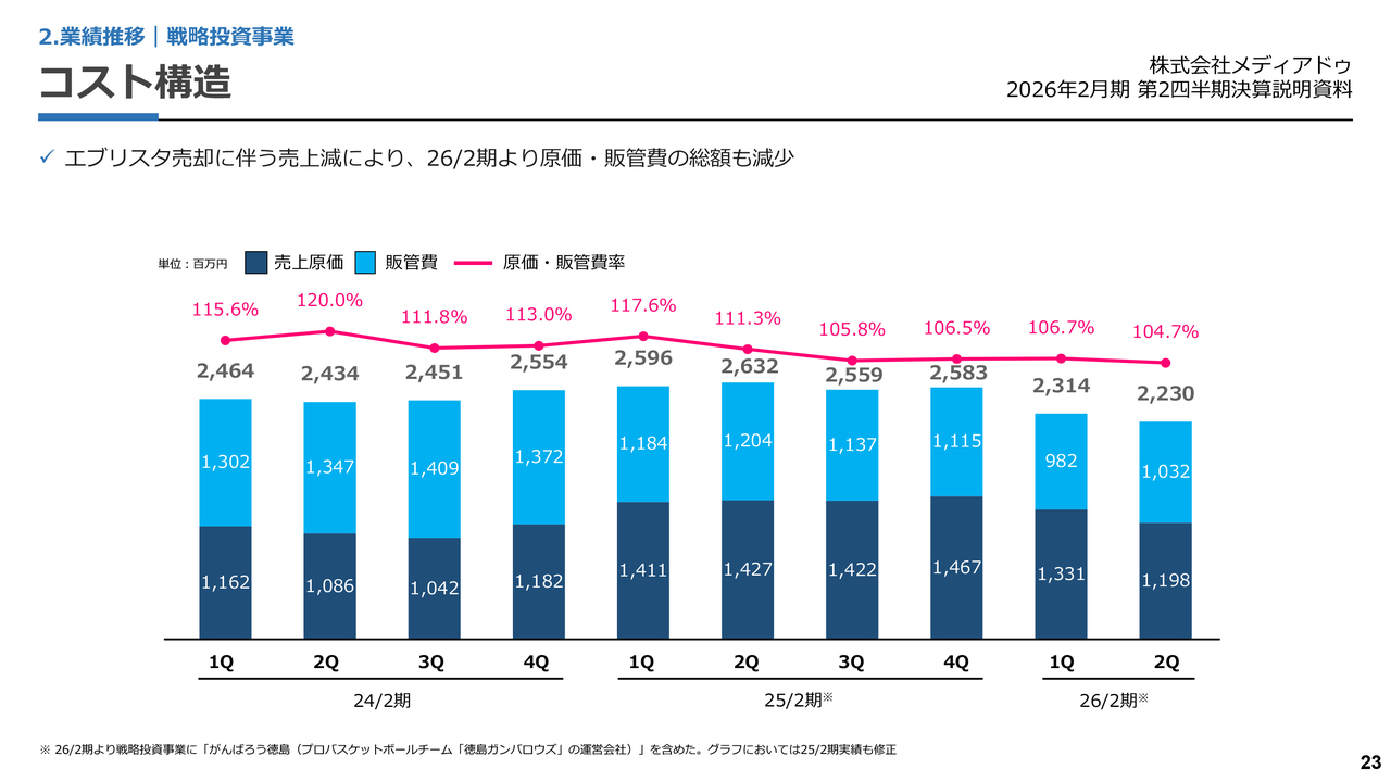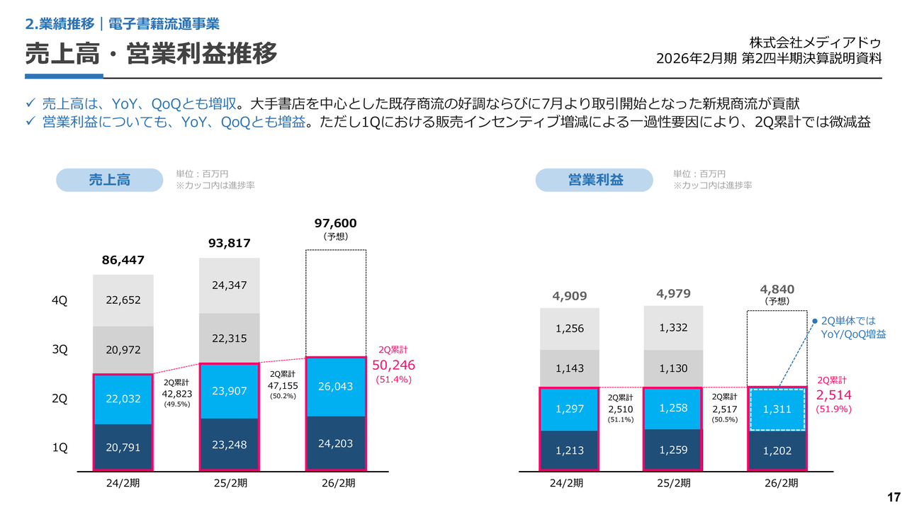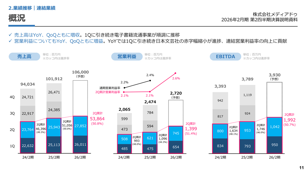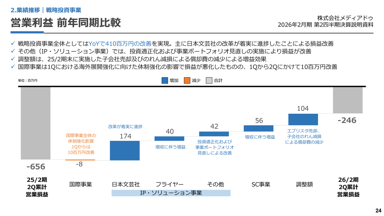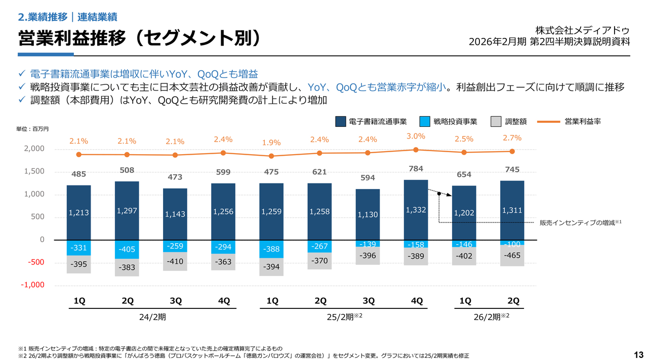 特に営業利益に関して、昨年度の営業利益率は2.4パーセント、第2四半期では2.1パーセントでしたが、2026年2月期第2四半期には2.6パーセントに改善しています。日本文芸社の赤字幅の縮小を主とした戦略投資事業の改善が、全体として営業利益率の向上に貢献した結果です。