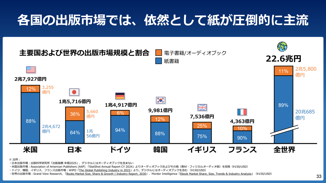 日本国内では、メディアドゥの貢献や国内の電子書店の活躍により、電子書籍のシェアがかなり拡大しています。しかし、世界全体に目を向けると、電子書籍のシェアはおおよそ10パーセント前後にとどまり、それ以外は紙の本のマーケットが占めています。