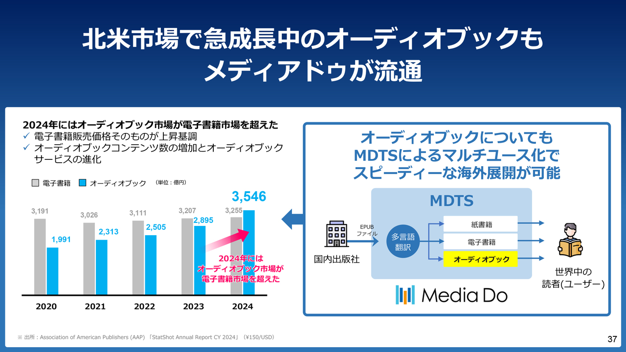 当社は、紙の本や電子書籍だけでなく、オーディオブックについてもさらなる事業展開を行いたいと考えています。スライド左側のグラフは、米国内の出版業界において電子書籍の市場規模を2024年にオーディオブックの市場規模が追い越したとするデータを示しています。