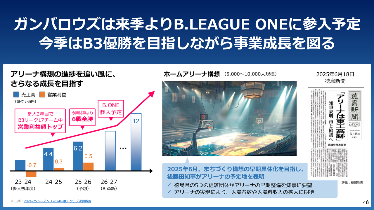 今年度の事業計画では、売上高6億2,000万円、営業利益5,000万円を目指しています。開幕から6戦全勝という結果もあり、計画の実現可能性は非常に高いと考えています。来年度は、BリーグのB3から、B2とB1の間に新たに設定される「B.LEAGUE ONE」に参入する予定です。