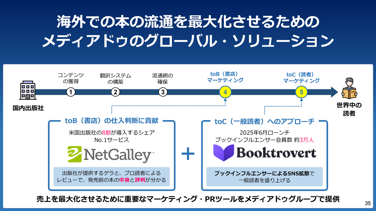 その中で、先ほどの「NetGalley」「Booktrovert」といったキラーソリューションで、書店に本を購入いただくためのツールを提供していきます。