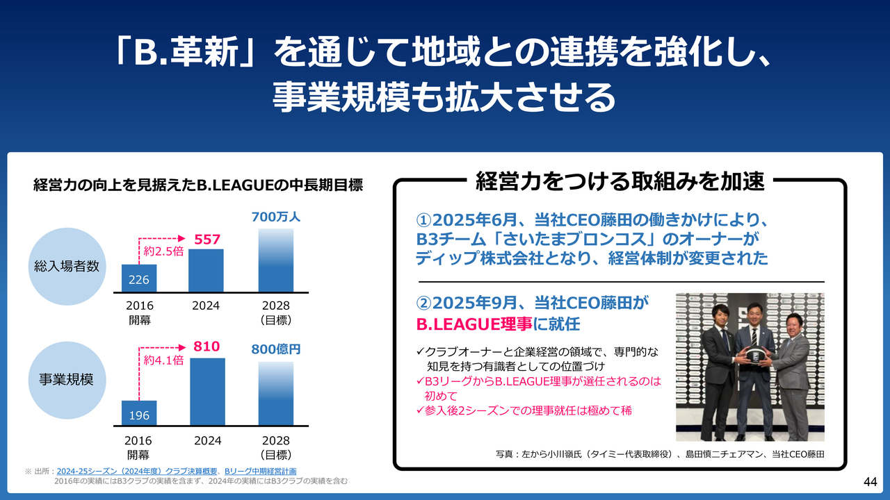 2016年にBリーグが開始されて以降、昨年度までの間、そして2028年に掲げている目標についてお話しします。総入場者数について、Bリーグ開始当初は226万人でしたが、この約8年で2.5倍の557万人にまで増加しています。さらに、2028年には700万人を目指しています。