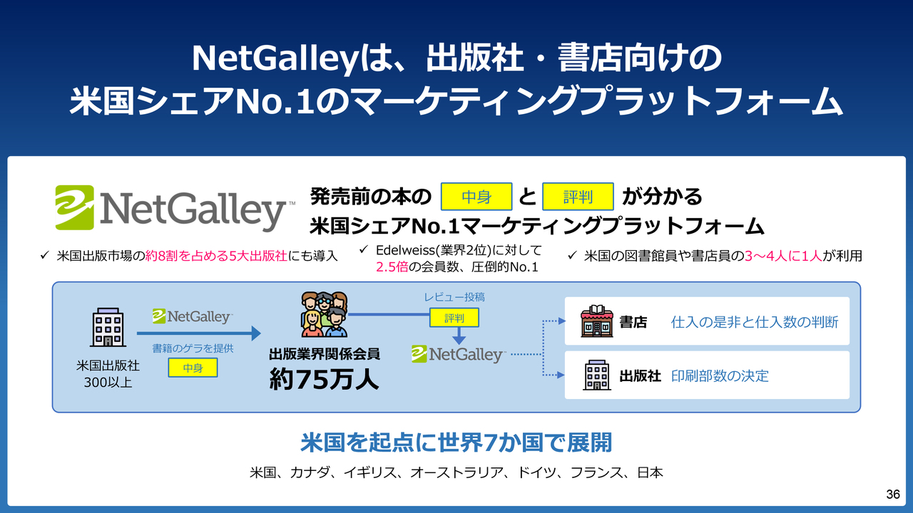 業界2位に対して、業界No.1の「NetGalley」は2.5倍の会員数を誇っています。本を購入してもらうための情報提供サービスとして、欧米における圧倒的な1位となっています。
