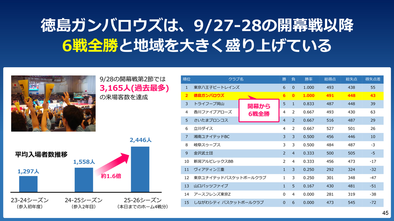 徳島ガンバロウズは、9/27-28の開幕戦以降6戦全勝と地域を大きく盛り上げている