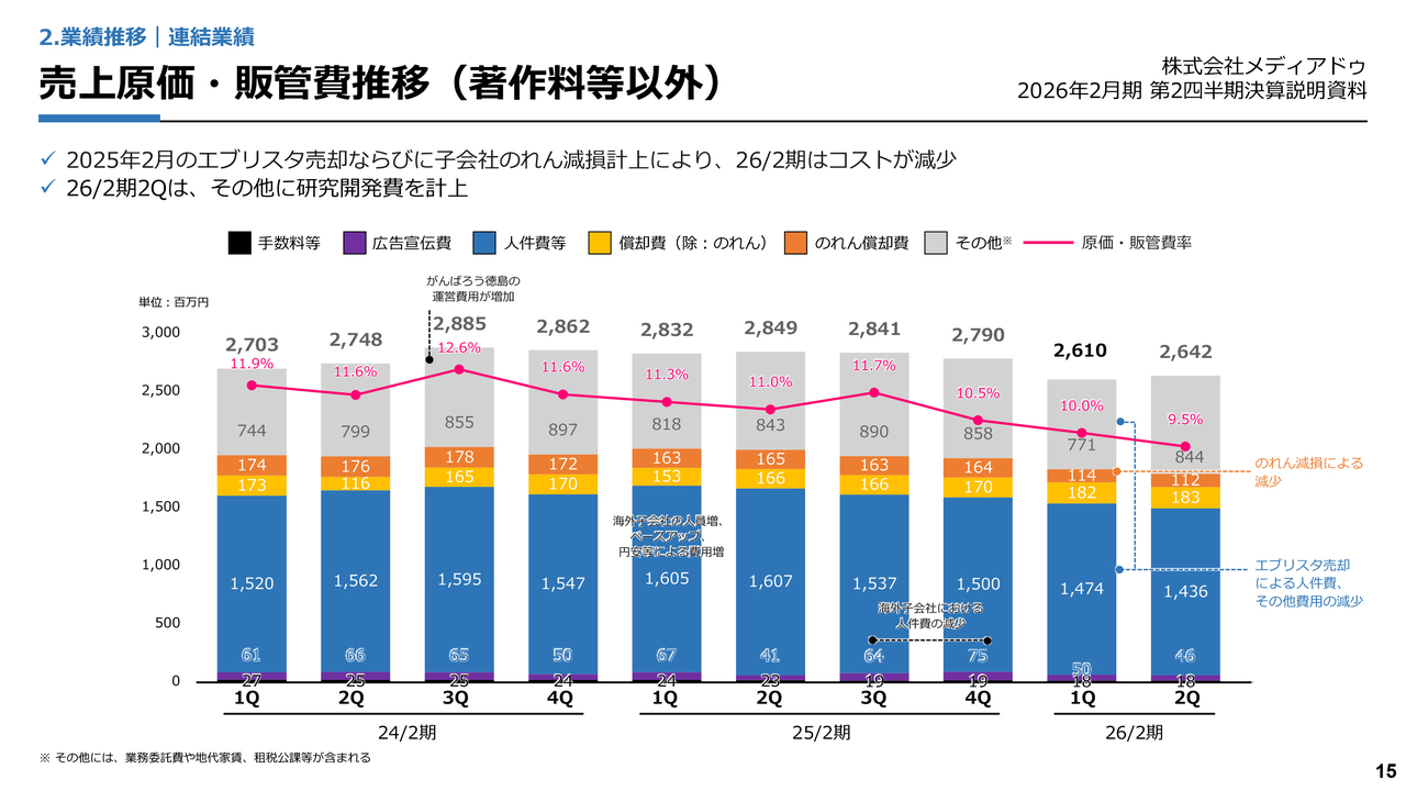 著作料以外の売上原価ならびに販管費の推移を示したグラフです。2026年2月期については、前期末に売却した「エブリスタ」に伴う業績の変化により、コストも減少しています。