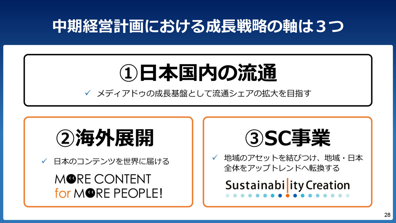 藤田恭嗣氏(以下、藤田):代表取締役社長CEOの藤田です。それでは、私から成長戦略についてお話しします。今年4月に発表した中期経営計画では、3つのポイントを掲げています。