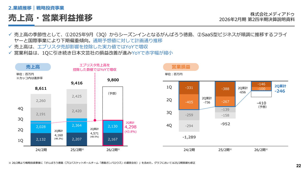 今期の着地予想である98億円に対して、進捗率は電子書籍流通事業と比較して低い水準にあります。ただし、今期の下期からシーズンインとなる「徳島ガンバロウズ」の運営法人であるがんばろう徳島の影響、SaaS型で徐々に積み上がっていくフライヤーの事業により、下期において売上の増加を見込んでいます。