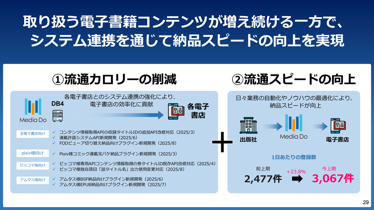 その結果、流通スピードが向上し、前上期における1日あたりの本のデータ登録件数は2,477件でしたが、今上期では3,067件となり、23.8パーセント増加しました。