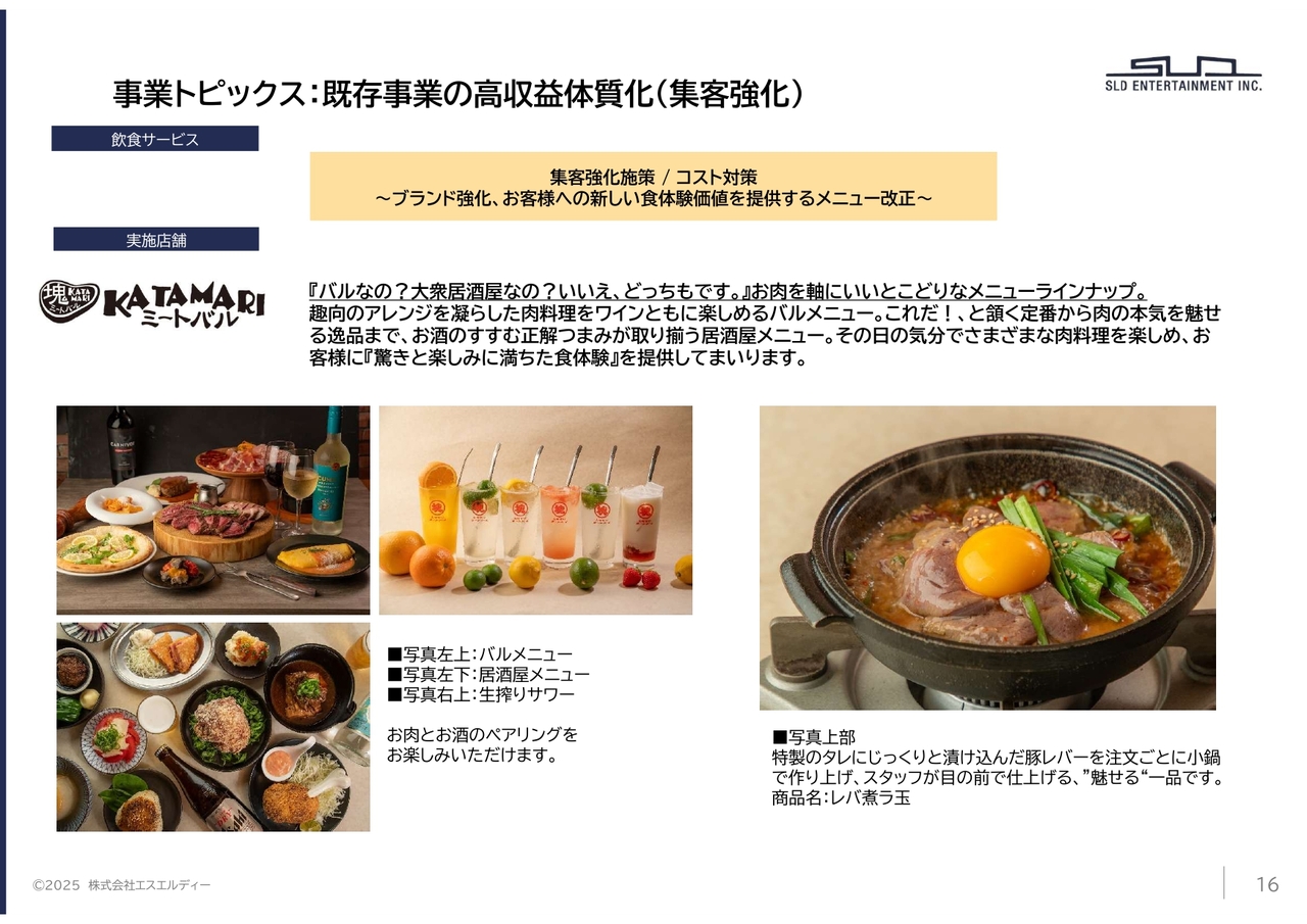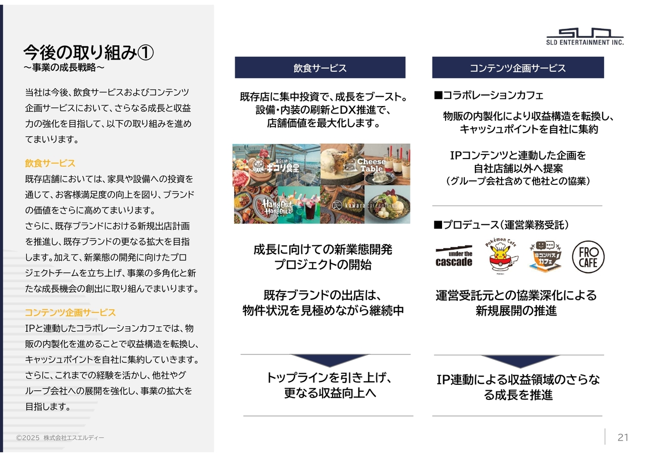 当社は今後、飲食サービス事業およびコンテンツ企画サービス事業において、さらなる成長と収益力の強化を目指して、このような取り組みを進めていきます。