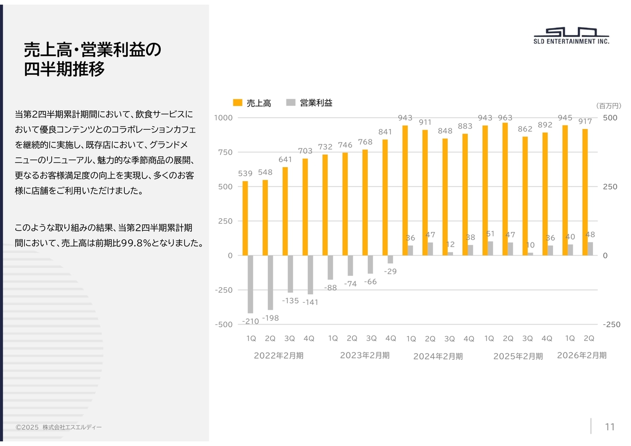 先ほどもお伝えしていますが、当第2四半期は、飲食サービスにおける既存店のグランドメニューリニューアルを実施、また季節ごとにお客さまのライフスタイルに合わせた魅力的な商品を提供することで、お客さまの来店動機の創出に努めてきました。