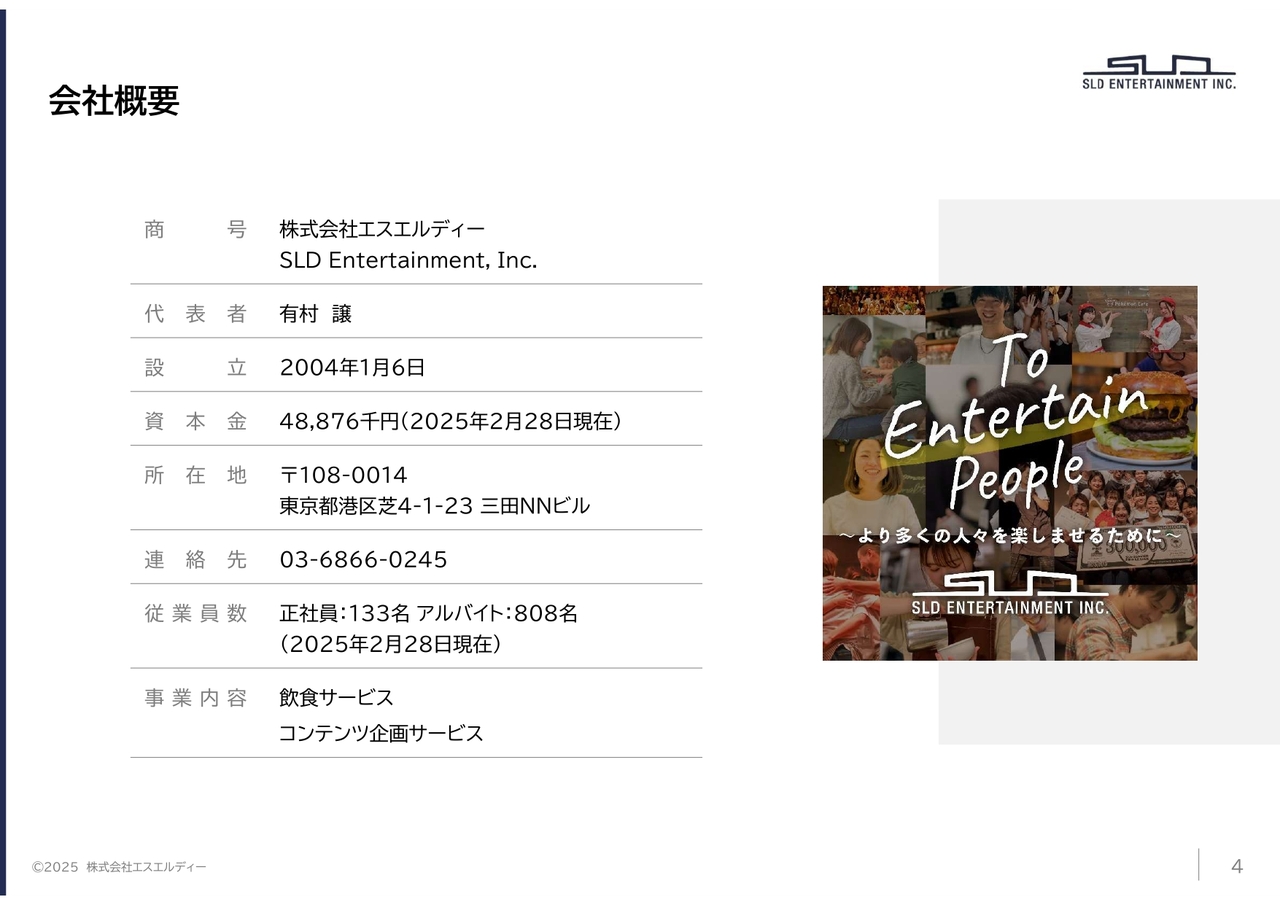 その前に、弊社の会社概要、事業内容を簡潔にご説明します。当社の創業は2004年、IPOは2015年となります。期末においての従業員数は、社員数133名、アルバイト808名となっています。