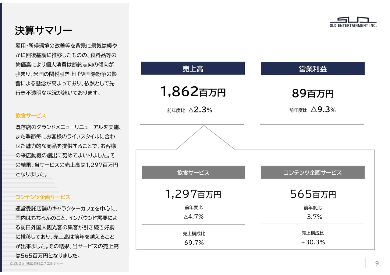 まずは、当事業年度の決算サマリーとなります。当事業年度における業績は、売上高18億6,200万円(前年同期比2.3パーセント減)、営業利益8,900万円(前年同期比9.3パーセント減)となりました。