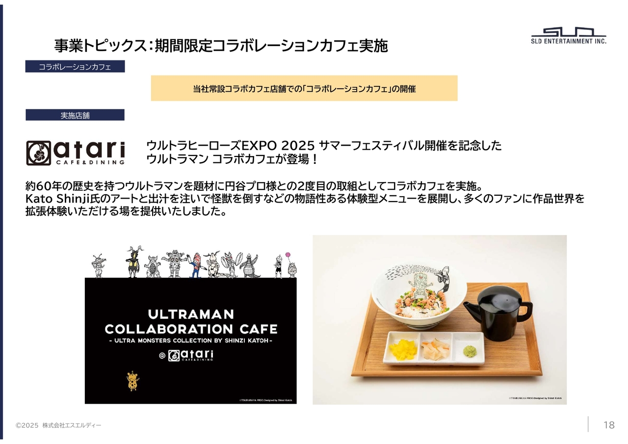 当第2四半期において、イベント「ウルトラヒーローズEXPO 2025 サマーフェスティバル」の開催を記念し、当社店舗にてウルトラマンコラボカフェを開催しました。Kato Shinji氏のアートと出汁を注いで怪獣と戦うなどの物語性ある体験型メニューを展開し、多くのファンに作品世界を拡張体験いただける場を提供し、連日ファンの方々に高く評価していただきました。