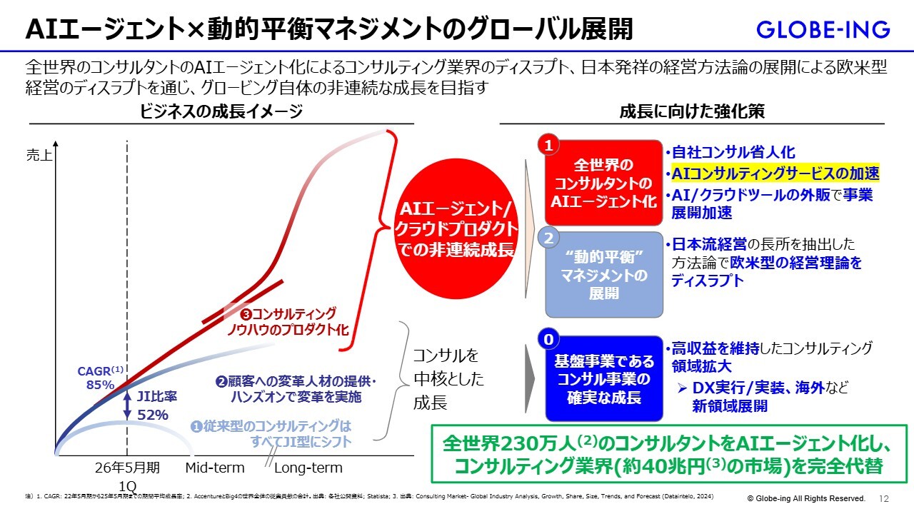 ここからは今後の成長戦略についてご説明します。基本的にはこれまでコンサルティング事業を中心に成長してきました。その上で、AIエージェント、クラウドプロダクト、動的平衡マネジメントを加え、さらなる成長と非連続的な成長を目指していきます。