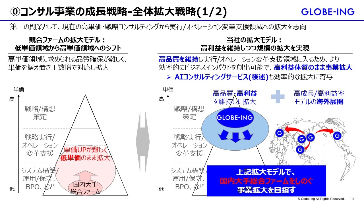 まずは、コンサル事業の成長戦略についてご説明します。競合ファームの拡大モデルとスライドに書いていますが、国内の大手総合ファームでは、低単価のコンサルティングから徐々に高単価へシフトアップすることで拡大を図っていると考えています。
