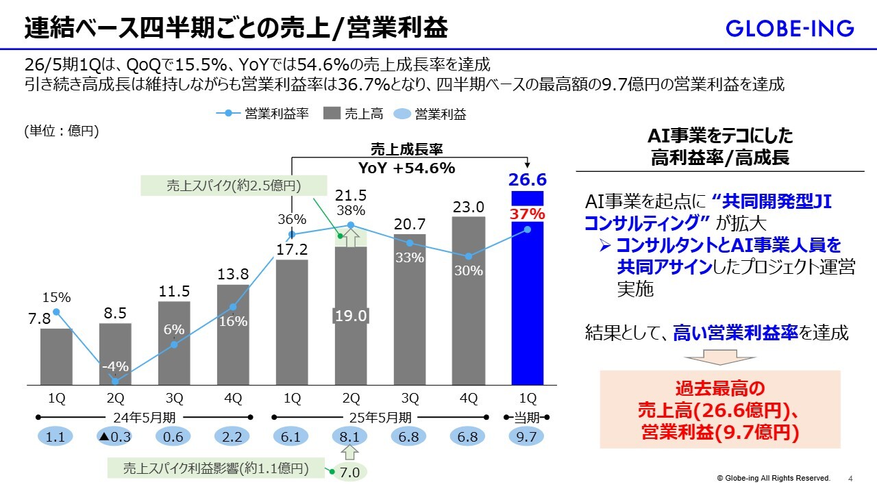【QAあり】グロービング、1Q業績は四半期最高、売上YoY+54.6%・利益+60.2% AI共同開発型「JIコンサルティング」拡大