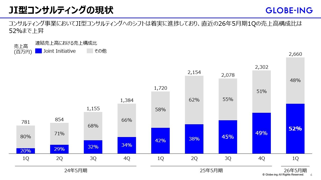 こちらのスライドは毎回お示ししているものです。JIコンサルティングが52パーセントを超え、半分以上まで拡大してきています。先ほど触れたAIエージェントを含む共同開発型のJoint Initiative案件が増加しており、それがJoint Initiative比率の上昇につながっています。