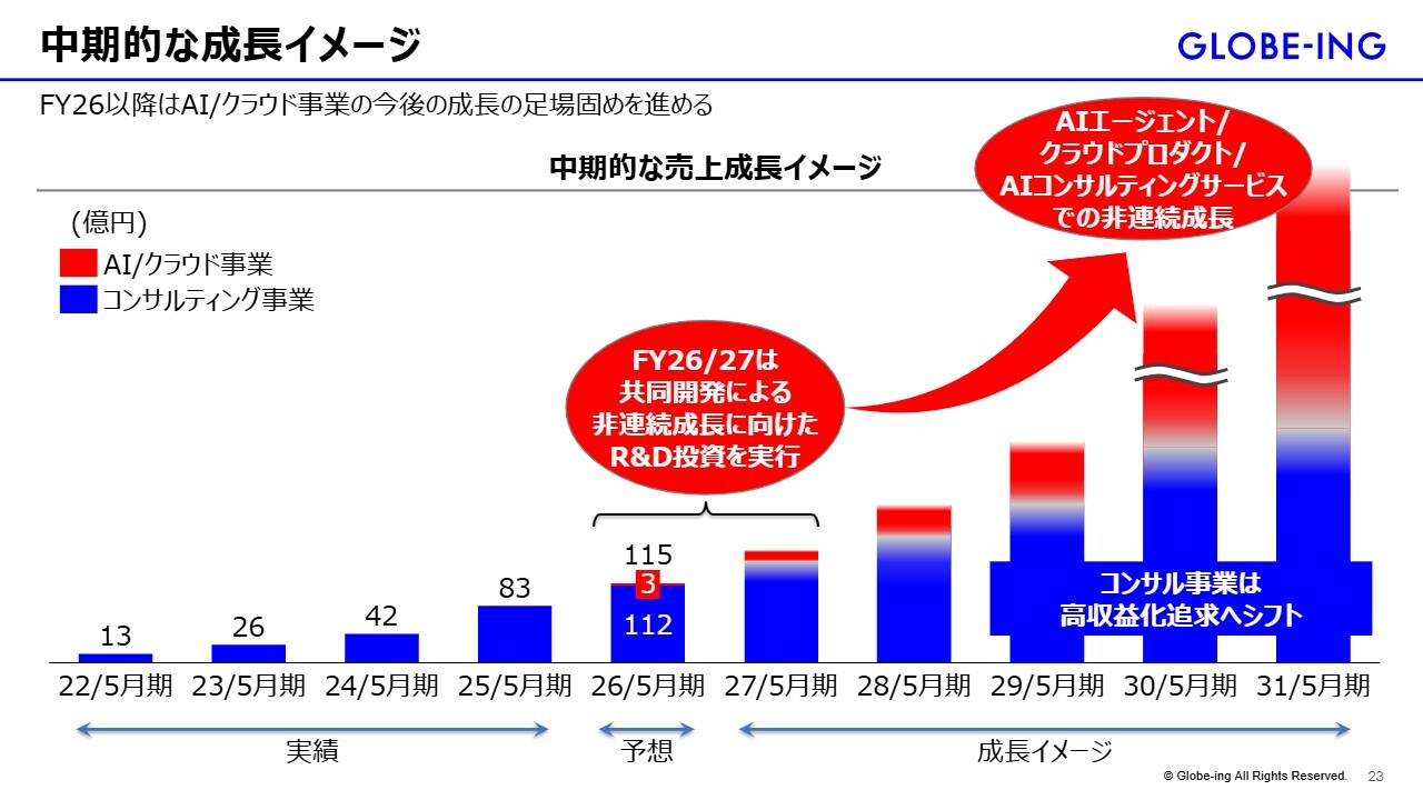 一方、グラフの赤い部分で示されるAI/クラウド事業については、2026年および2027年において、共同開発によるプロダクトを実際に作り上げること、あるいはAIコンサルティングサービスをしっかりと立ち上げることを目指しています。