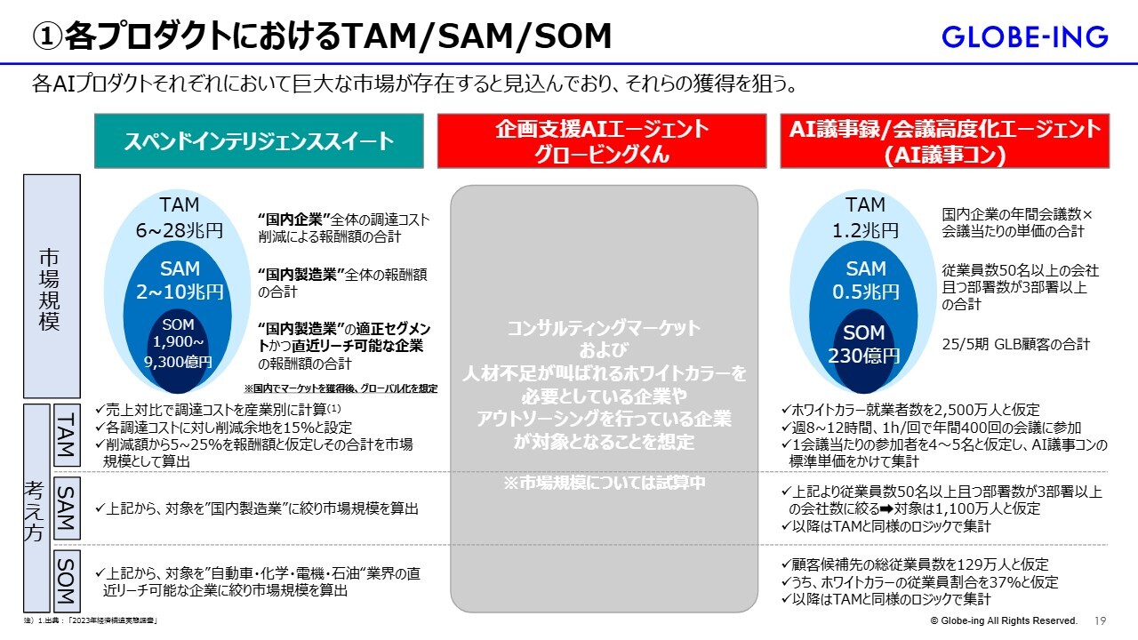 スライドの右側にある、会議の高度化を目的とした「AI議事コン」については、会議に限定した場合でも、TAMは1兆2,000億円、SAMは5,000億円、SOMは230億円という規模になります。このAIエージェントは、企画支援の「グロービングくん」と「AI議事コン」を掛け合わせた市場規模を想定しており、企画支援まで含めることで、より大きな市場と相対していくかたちになると考えています。