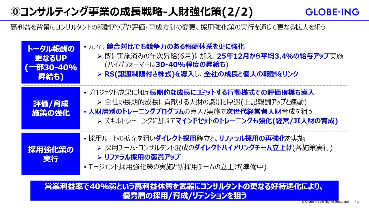 これらの施策では、営業利益率が40パーセント弱という非常に高い利益体質を武器に、コンサルタントの好待遇化を進めることで、優秀な人財の採用、育成、そして定着を図っています。