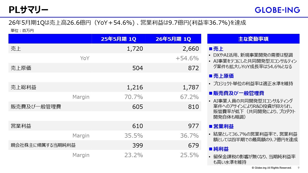 PLサマリーです。売上高は26億6,000万円で、成長率は前年同期比54.6パーセントとなっています。これはDXやAI活用、新規事業の需要が順調かつ堅調に推移していることに加え、先ほどご説明したAI事業を軸とした共同開発型のJIコンサルティング案件が売上拡大に寄与し、高い成長率を実現した結果です。
