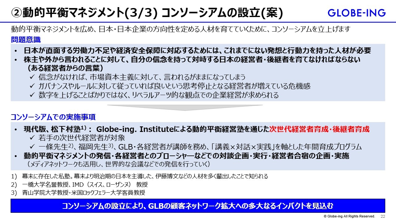 これは次世代の経営者や後継者の育成を目的としており、現代版の松下村塾を目指しています。弊社のGlobe-ing. Instituteによる「動的平衡経営塾」を通じて、若手の次世代経営者を対象に育成を担っていくことを目指します。