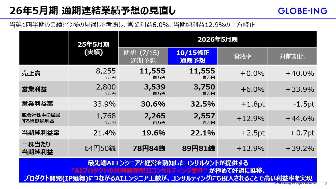 プロダクトの開発を進めながら、AIエンジニアの工数をコンサルティングにも活用することで、高い営業利益率を実現しています。このような点を踏まえ、今回の業績予想を修正しました。