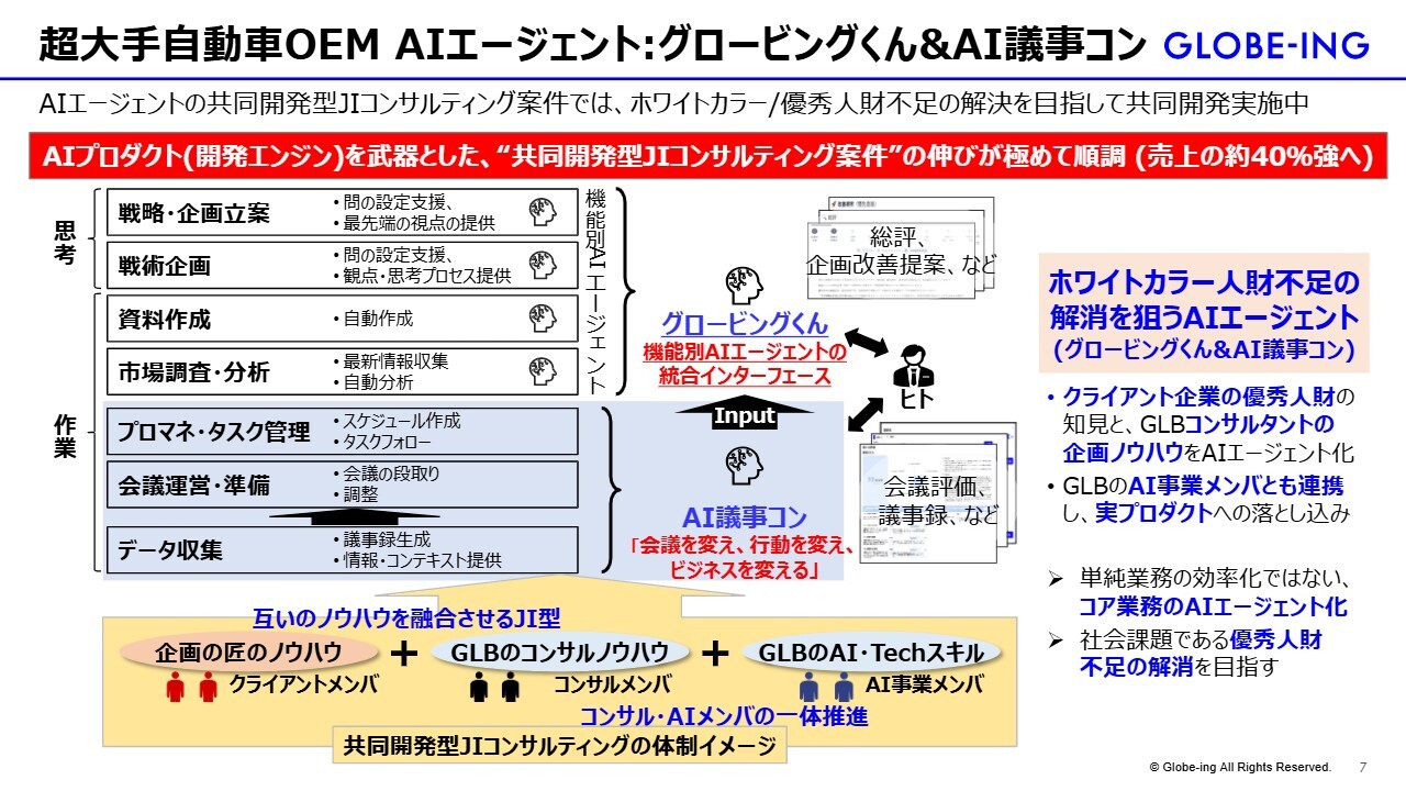 企画支援AIエージェントの「グロービングくん」と会議高度化AIエージェントの「AI議事コン」の2つについては、自動車OEM各社とのプロジェクトを進めており、特定メンバーでの使用を開始した後、10月には1部門でのリリースにまで到達しました。