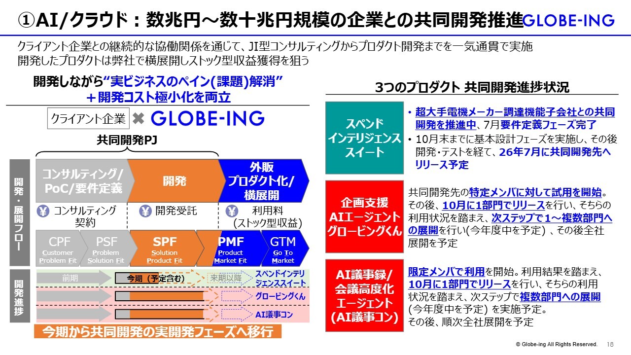 「スペンドインテリジェンススイート」は大手電機メーカーとの共同開発案件で、7月には要件定義フェーズが完了しており、10月末までに基本設計フェーズに移行する予定です。その後、開発テストを経て、来年度となる2026年7月に共同開発先へのリリースを行い、Product Market Fitに進む段階に入っていると考えています。