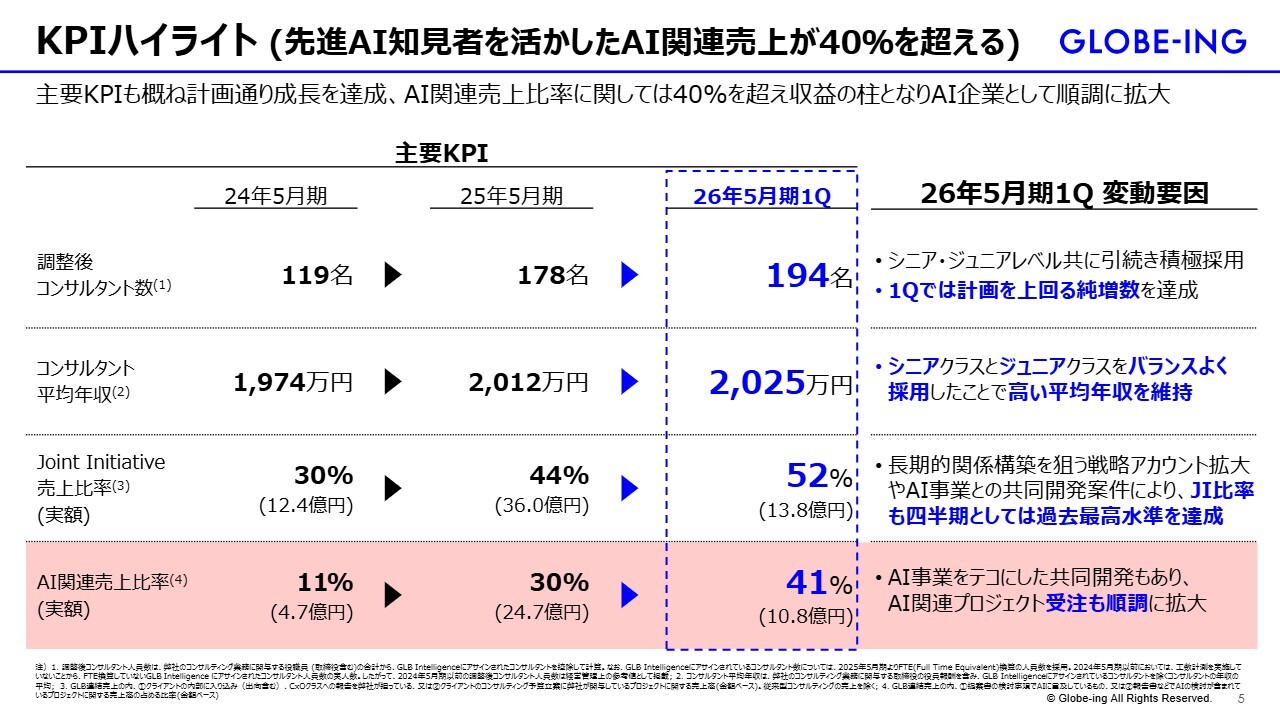 KPIのハイライトです。4つの主要KPIとしてお示ししている、調整後コンサルタント数、コンサルタント平均年収、Joint Initiative売上比率。AI関連売上比率は、いずれも順調に成長しています。