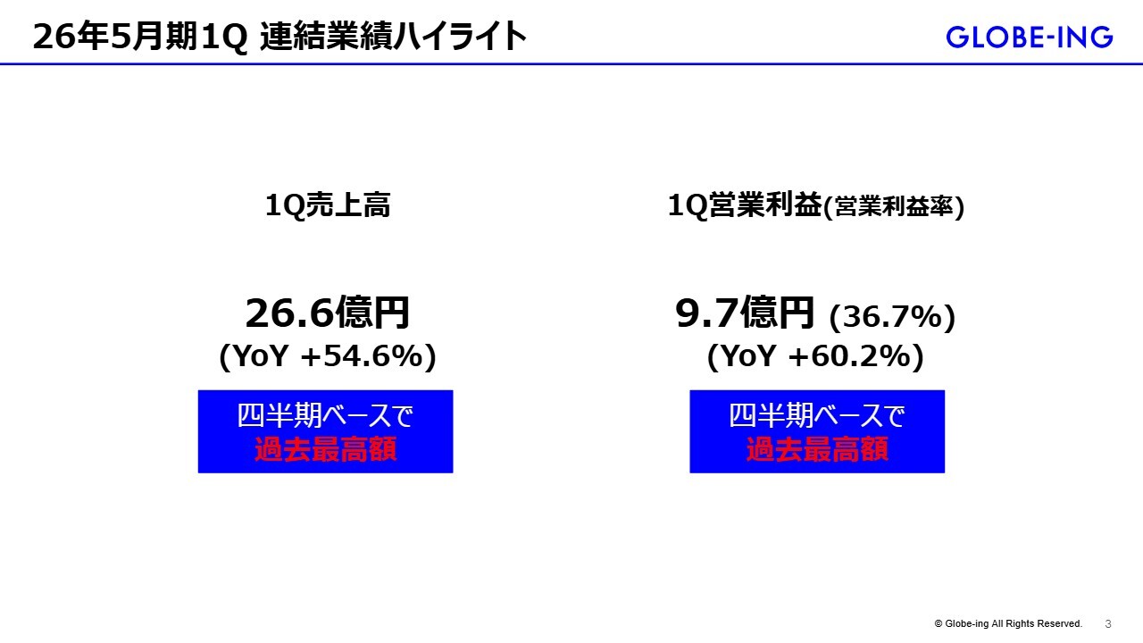 2026年5月期第1四半期の連結業績のハイライトです。売上高は前年同期比54.6パーセント増の26億6,000万円と成長しました。営業利益は前年同期比60.2パーセント増の9億7,000万円、営業利益率は36.7パーセントと、こちらも高い成長を達成しています。