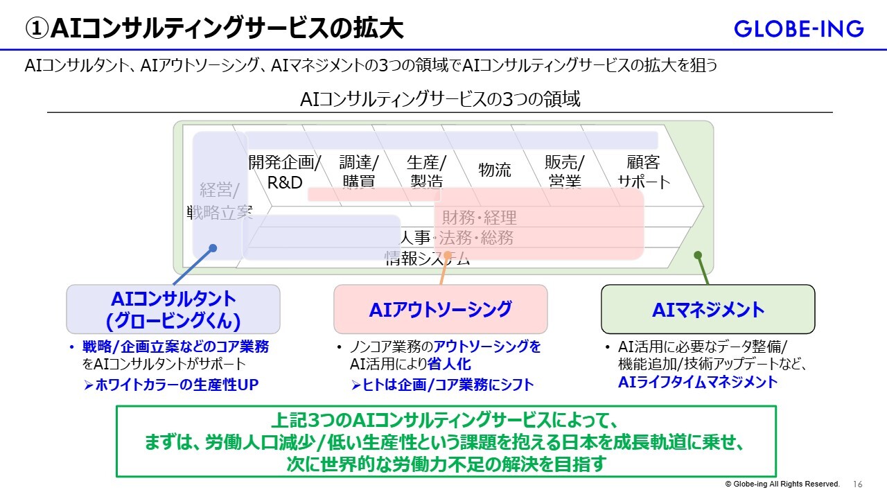 AIコンサルティングサービスとして、3つの領域での拡大を狙っています。1つ目はAIコンサルタントの「グロービングくん」と呼ばれる領域です。ここでは、戦略や企画立案といったコア業務をAIコンサルタントがサポートすることで、ホワイトカラーの生産性向上を目指します。