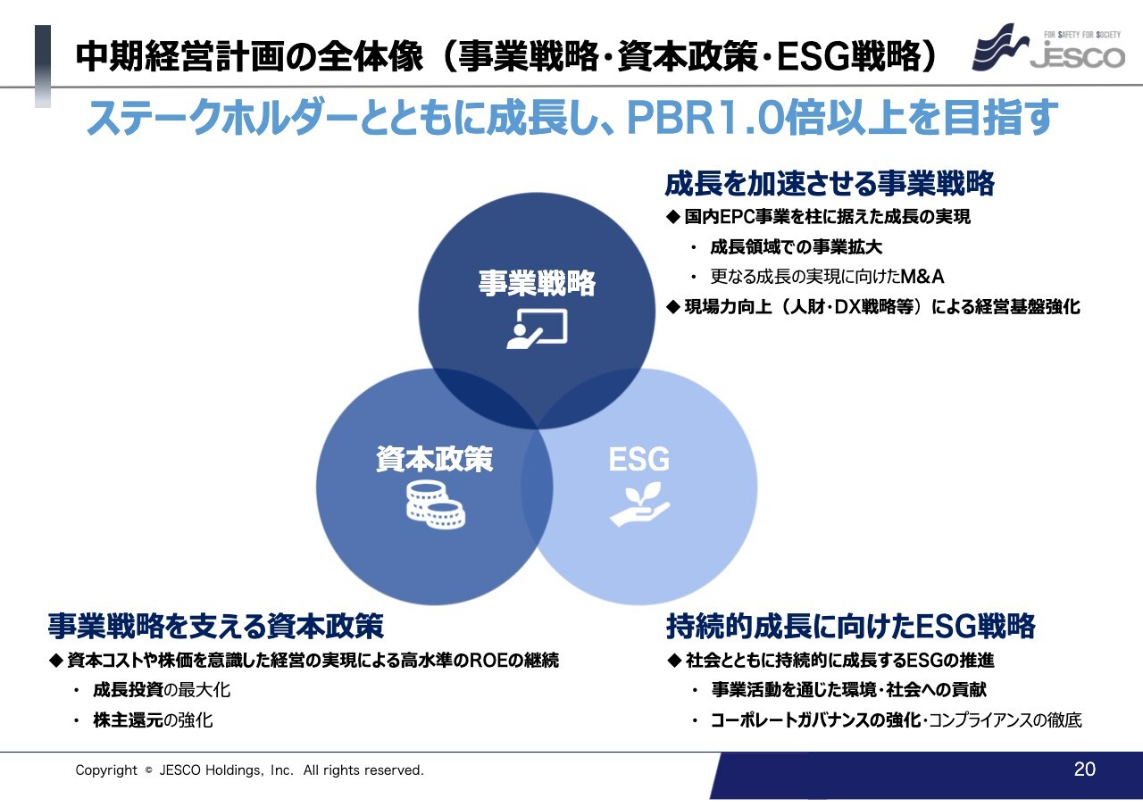中期経営計画の全体像をご説明します。事業戦略、資本政策、ESGを3本柱とし、ステークホルダーのみなさまと共に成長し、PBR1.0倍以上を目指していきます。