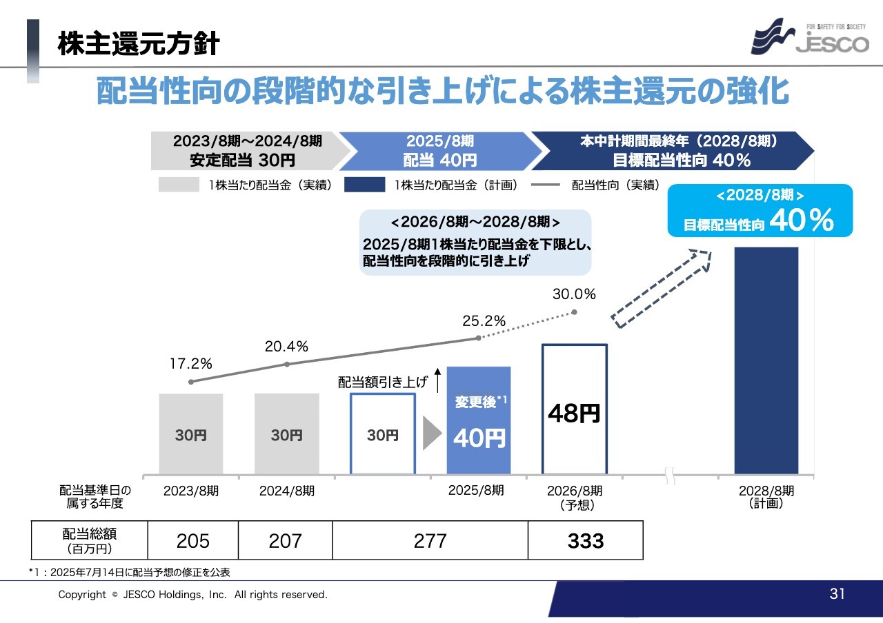 先ほど、配当についてはご説明しましたが、本中期では、2028年8月期に向けて、2025年8月期の配当40円を下限として、段階的に引き上げて、配当性向40パーセントを目指していきます。