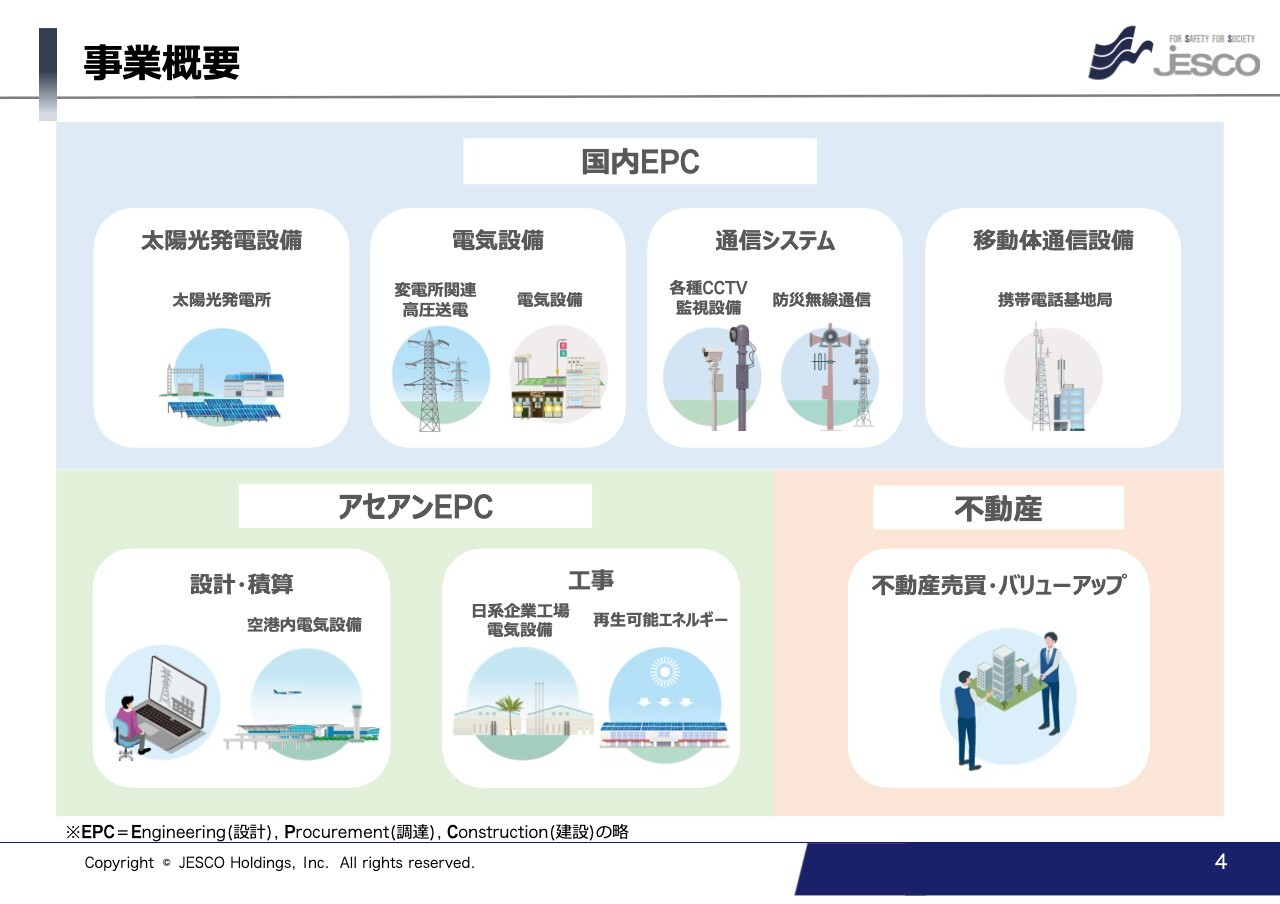 事業概要はスライドに記載のとおりです。3つのセグメントに分かれており、創業より培ってきた電気設備、電気通信設備等において、設計・調達・建設まで一貫して手掛けています。