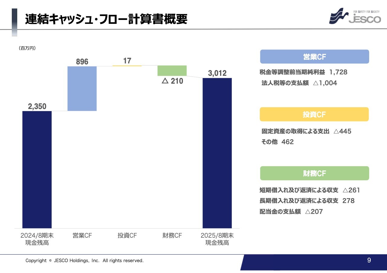 営業CFは売上増が寄与し、前期比プラス8億9,600万円、投資CFはプラス1,700万円、財務CFは主に借り入れ及び返済による増減と、配当金の支払いによりマイナス2億1,000万円、最終的な現金及び現金同等物の期末残高は、約7億円増加し、30億1,200万円となりました。