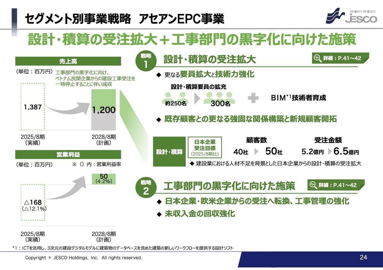 アセアンEPC事業は売上高14億円、営業利益はマイナスを大幅に改善する計画です。今期も一部貸倒引当金を織り込んでいるものの、先ほどご説明したとおり、設計・積算の拡大、また工事部門は回収リスクの低い案件に取り組んでいきます。