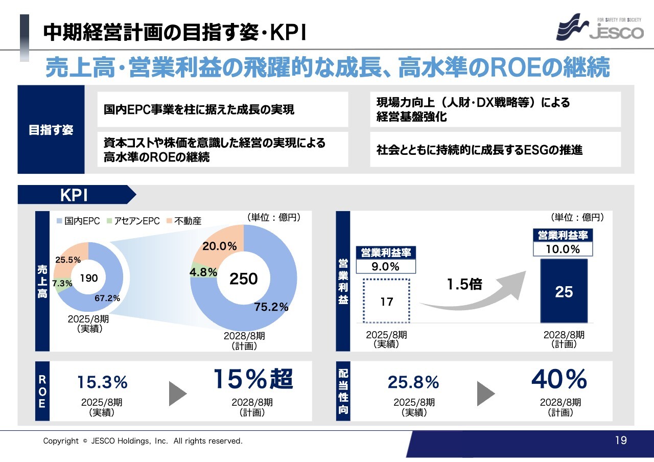 KPIについては、2028年8月期の売上高は250億円ですが、国内EPCの比率を75.2パーセントに拡大していきます。営業利益は、25億円ということで、営業利益率10.0パーセントを目指していきます。また、ROEは、15パーセント以上をキープし、配当性向は、2028年8月期には40パーセントを目指していきます。