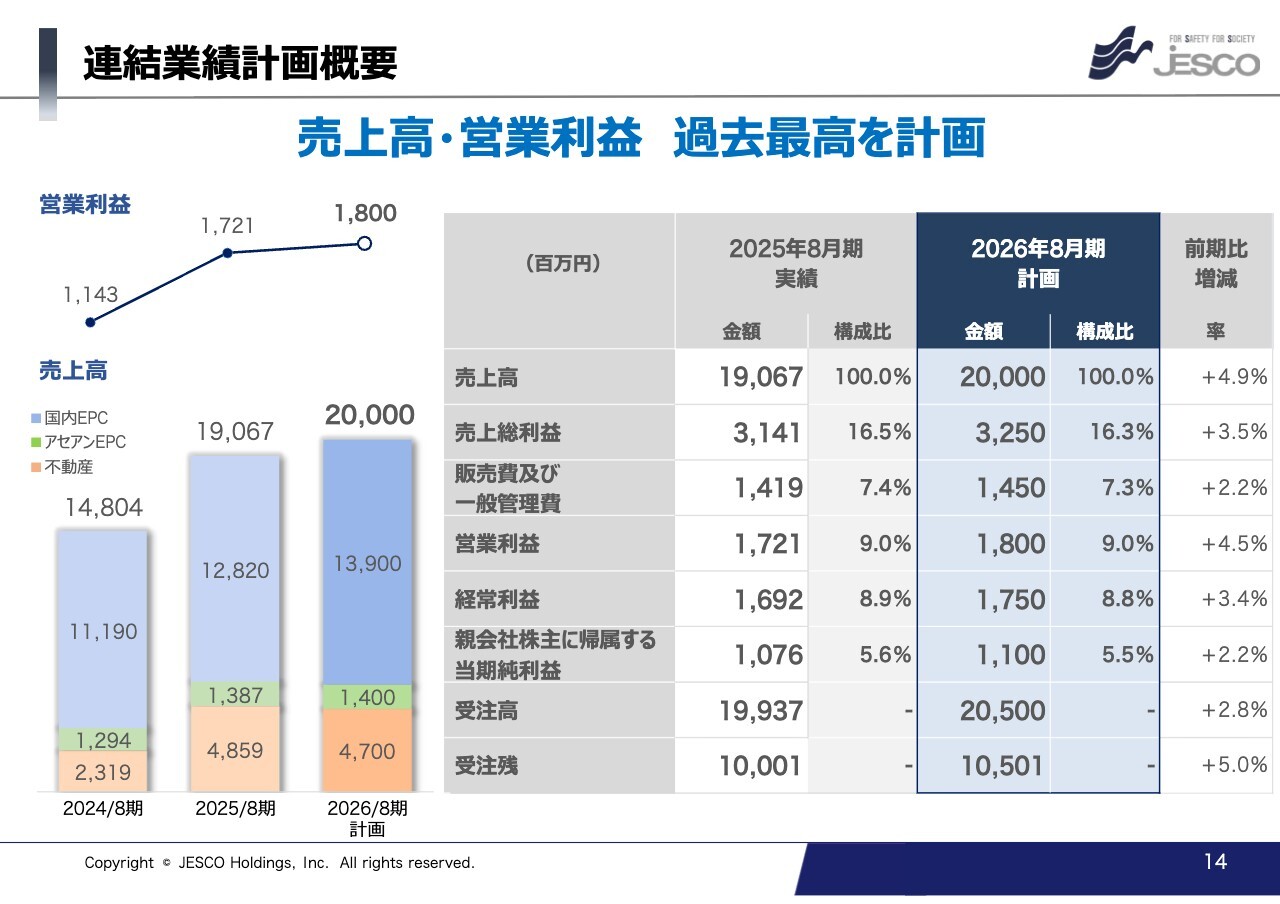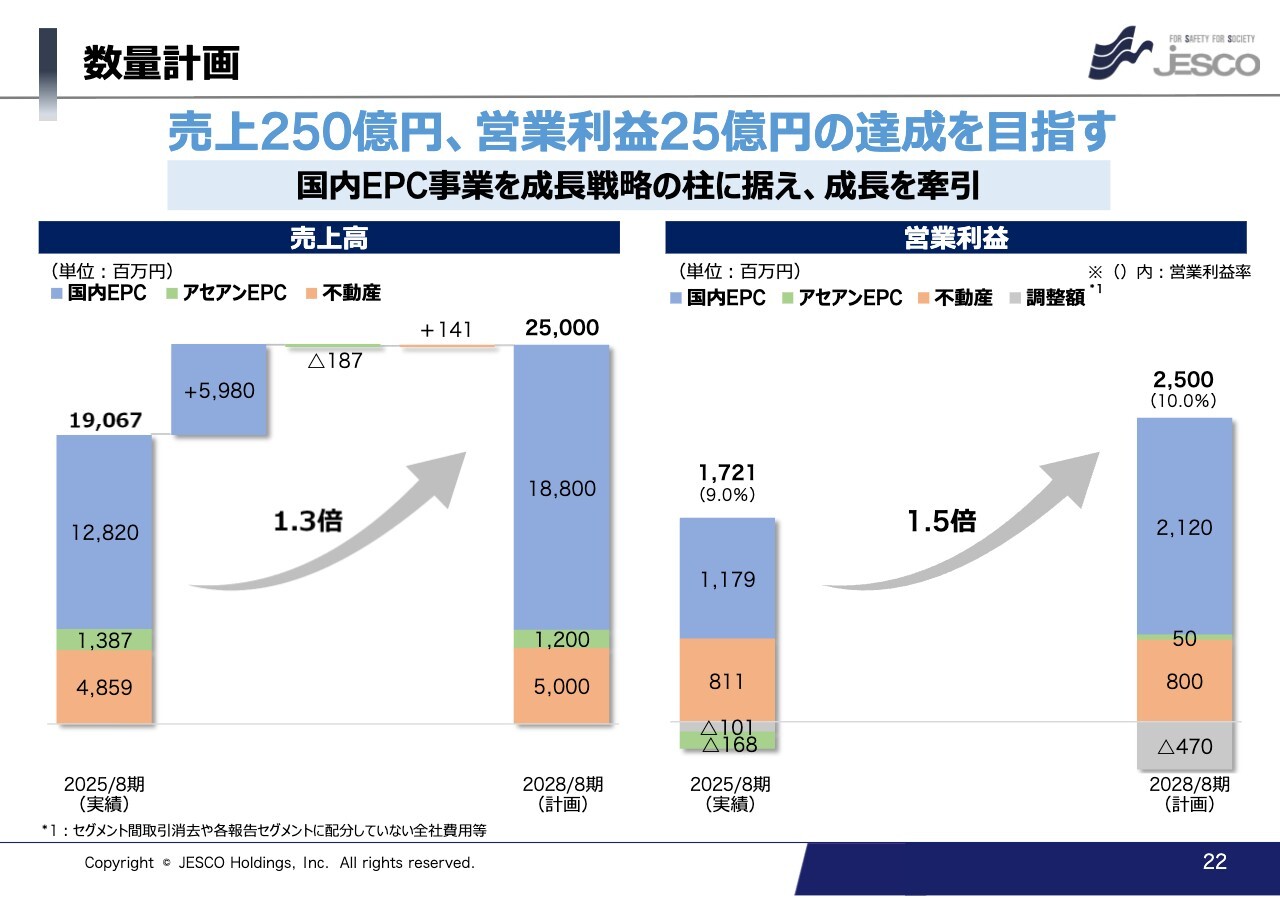 先ほどもご説明したとおり、2028年8月期の数量計画は、売上250億円、営業利益25億円となっています。スライドのグラフに記載のとおり、2025年8月に対して、売上で1.3倍、営業利益で1.5倍を目指していきます。特に国内EPCを成長の柱に据えて、成長を牽引していきます。